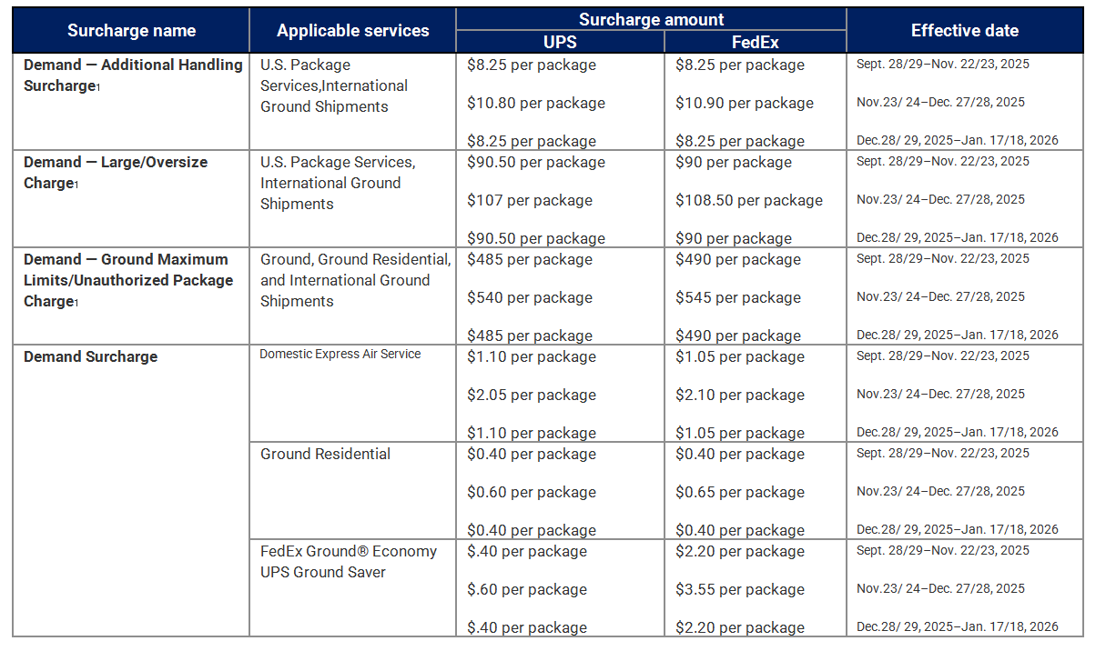 Over the past five years, more surcharges have been added to the demand surcharge. In 2024, the national carriers decided to apply a demand surcharge fee on almost all shipments, which they simply labeled “Demand Surcharge.” The demand surcharge timeframe is divided into three periods.